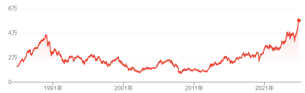 日経平均株価の長期チャートを見てみても、バブル崩壊から約30年間株価がまったく上がっていないのがよくわかります。