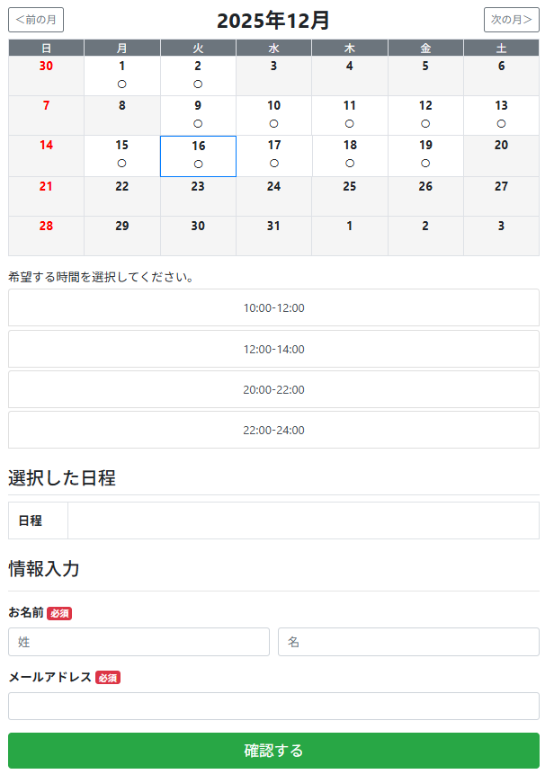 ②希望日と時間帯を選択し、お名前、メールアドレスを書く